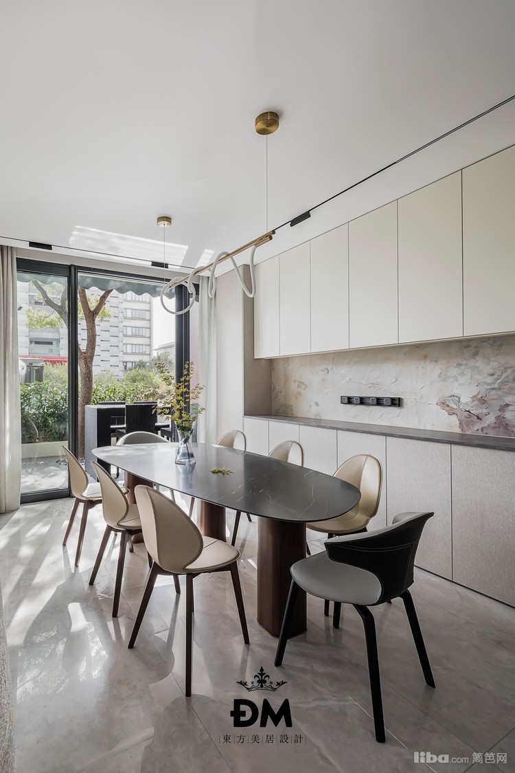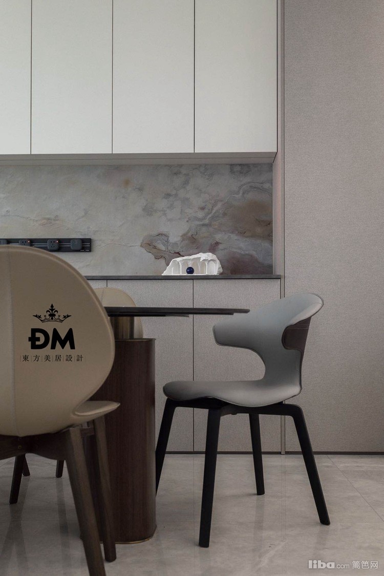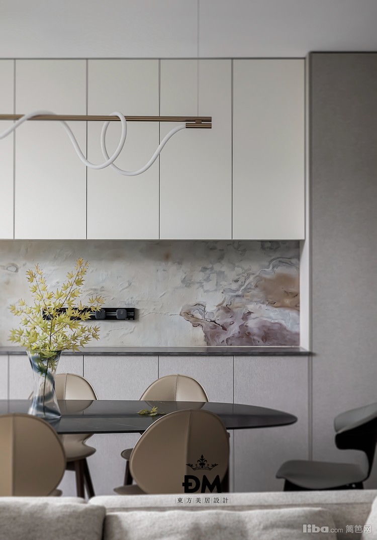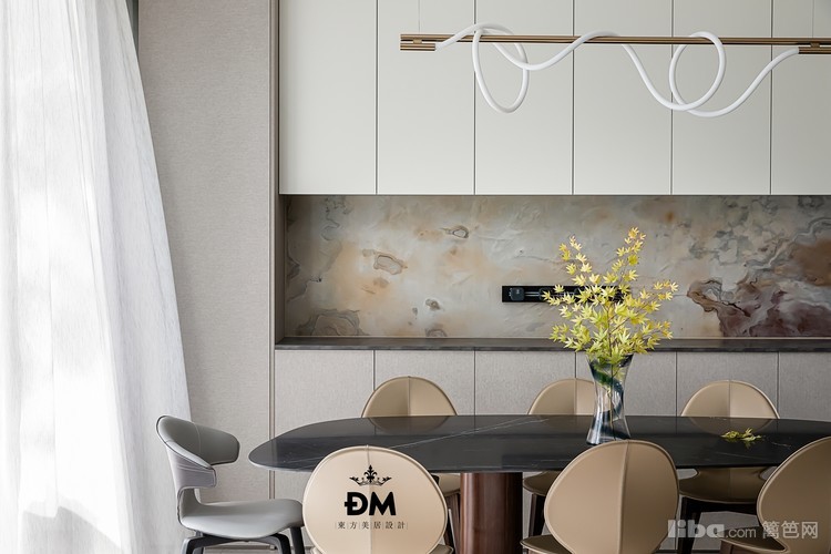 客厅的餐边柜用了双色饰面处理,增加了细节的冲击感,墙面用了石皮,色彩感,肌理感都非常充足,搭配轨道插座,非常灵活。