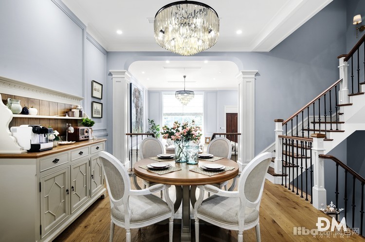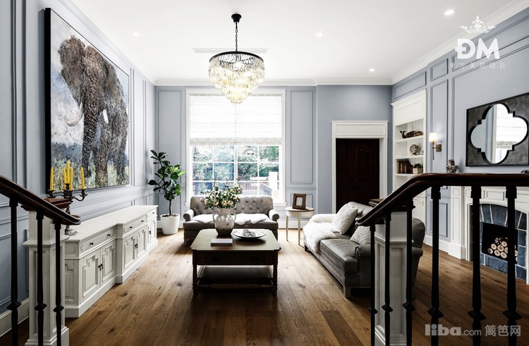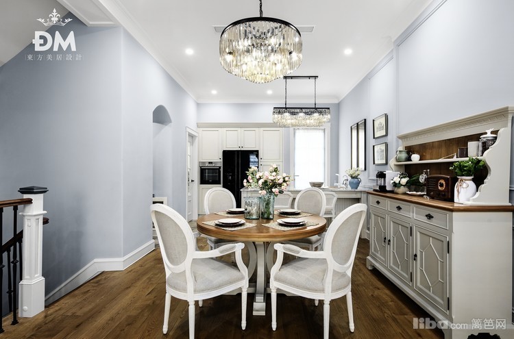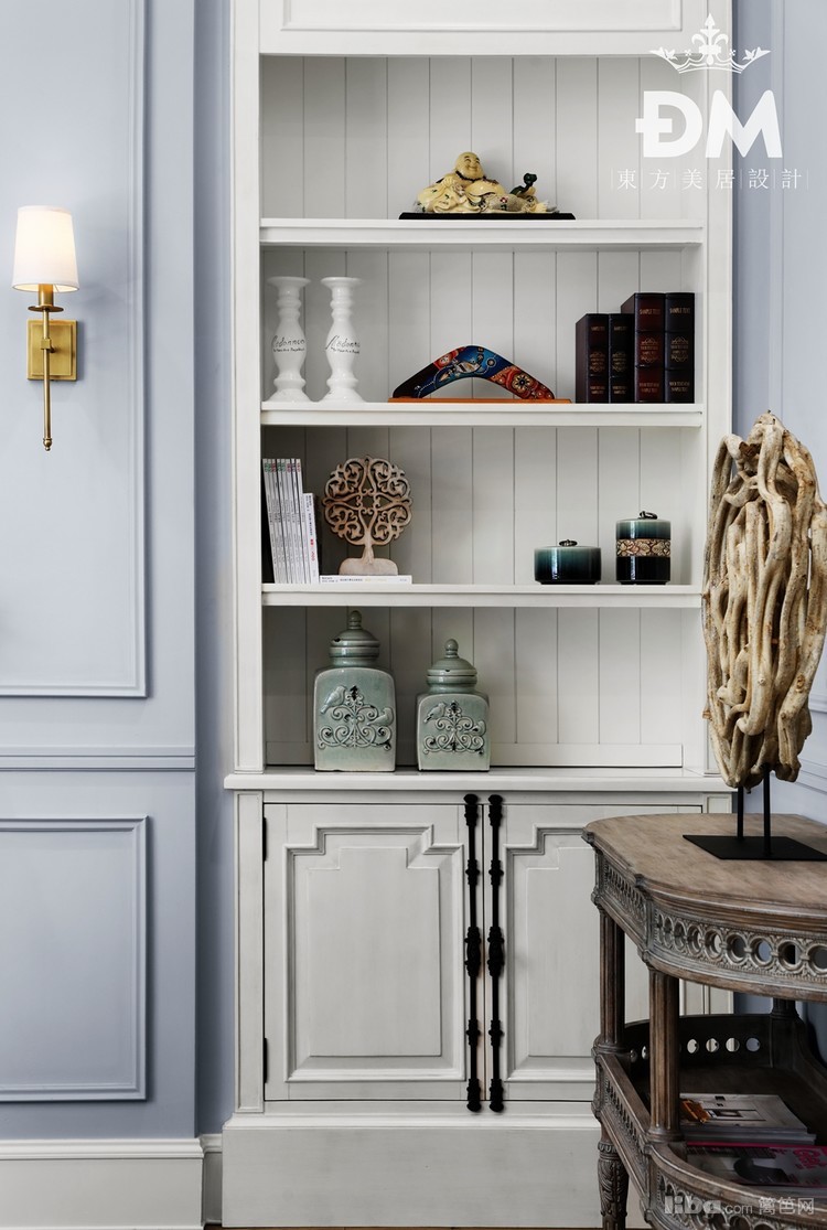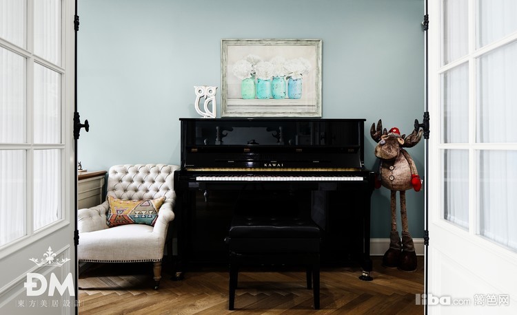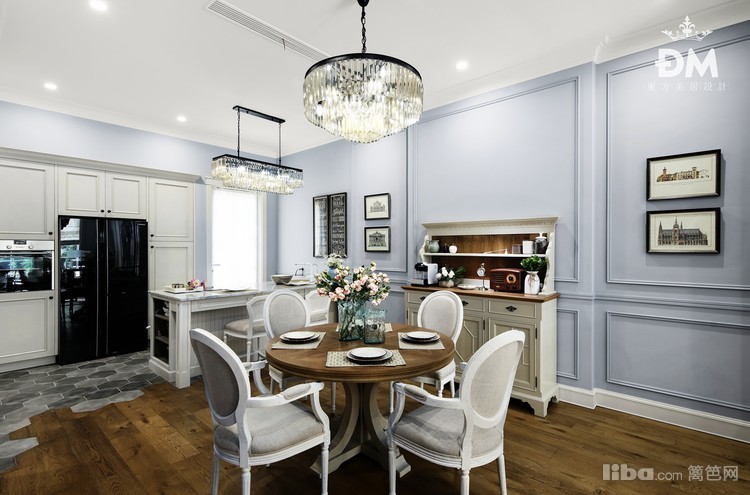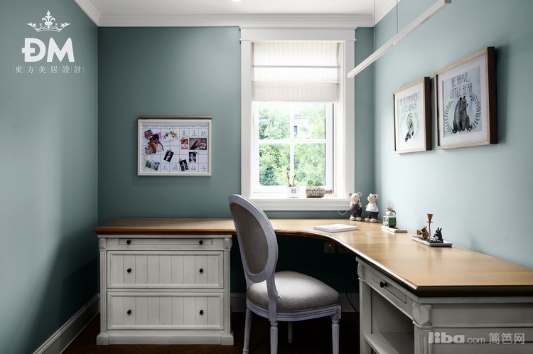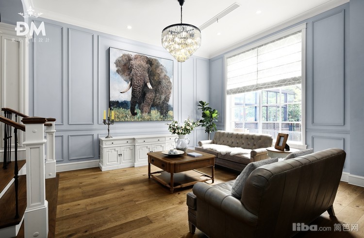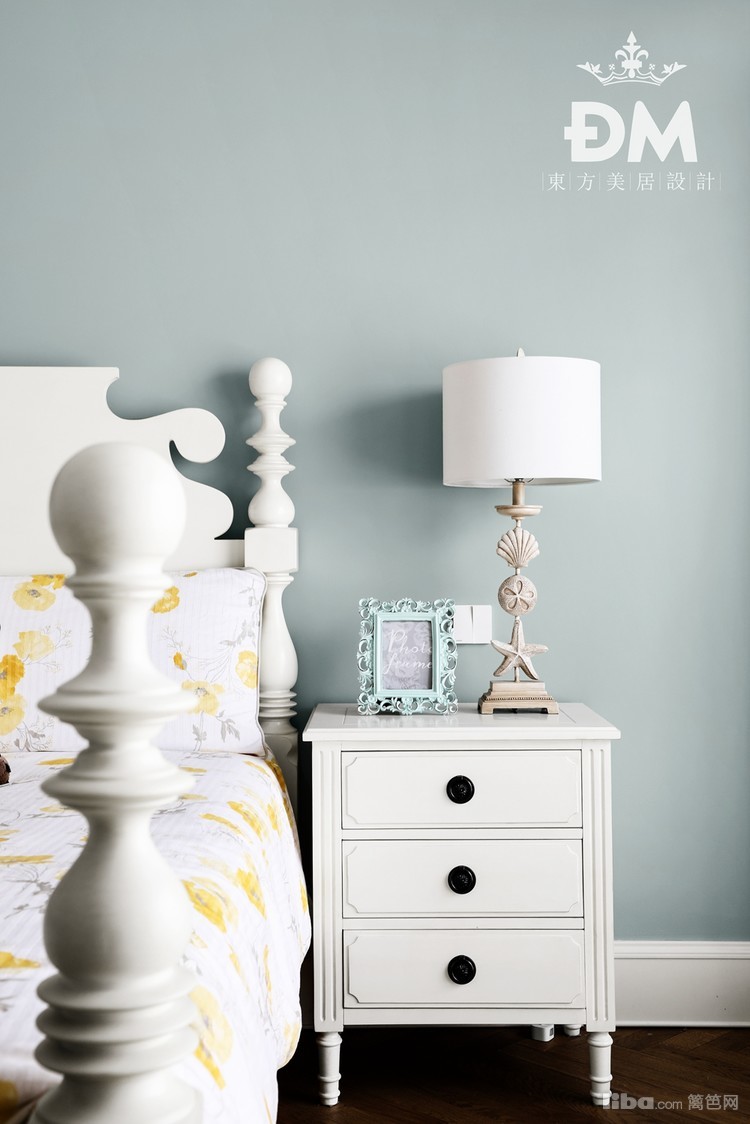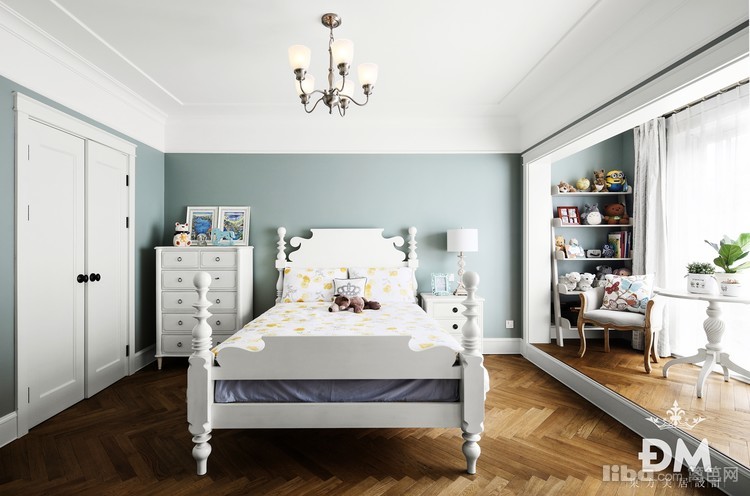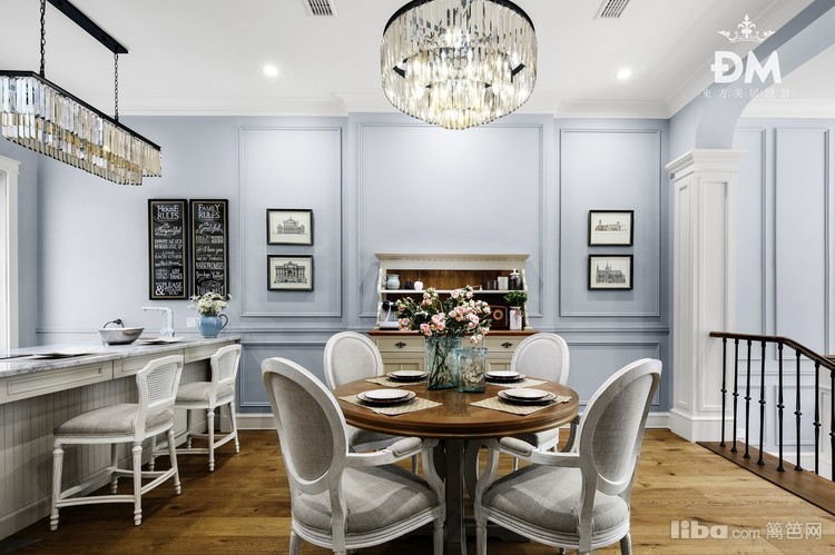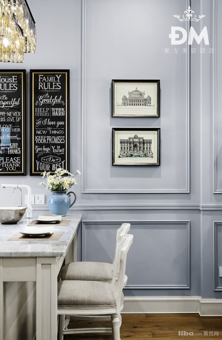 简美——简约+美式,采用淡蓝色的石膏线装饰墙体,颜色比较清新淡雅,符合业主的性格,吊顶简单,不繁重