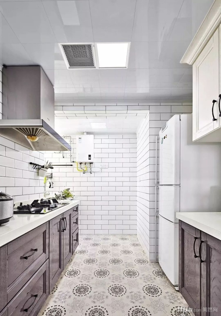 厨房地面采用六边形花砖拼贴,墙面以白色地铁瓷砖工字铺贴,深浅搭配橱柜简洁实用。