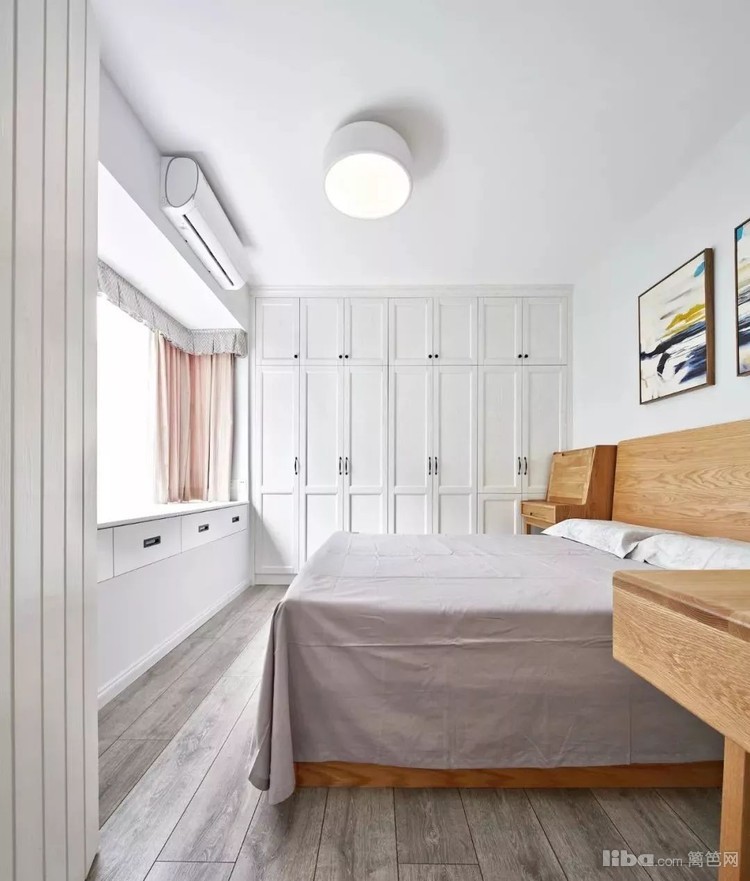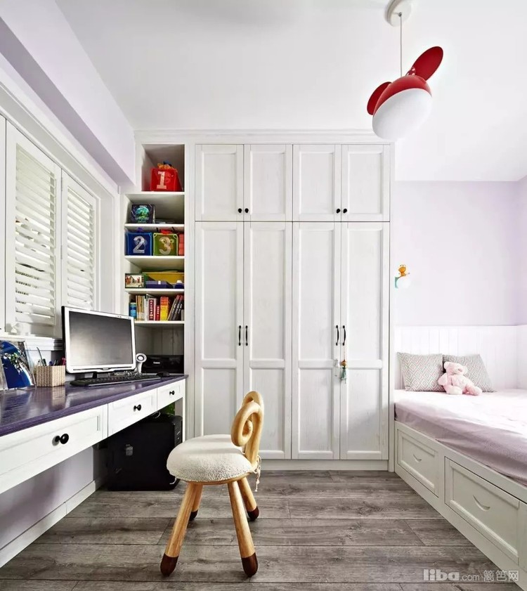 儿童房以柔和的淡紫色为基调,搭配趣味性家具与灯饰,充分表现孩子个性的生活方式,主卧地面通铺灰色系木质地板,侧面嵌入式置顶大衣柜,床尾采光飘窗兼具抽屉收纳。