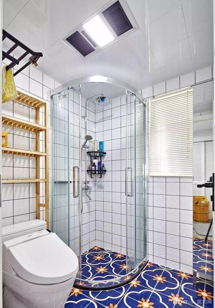 卫生间花砖地面搭配白色暗花瓷砖,智能马桶享受智能生活。