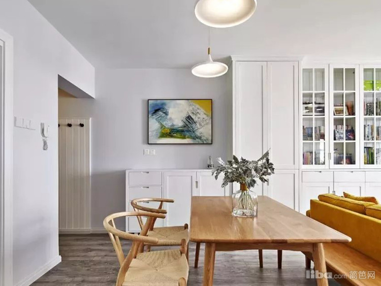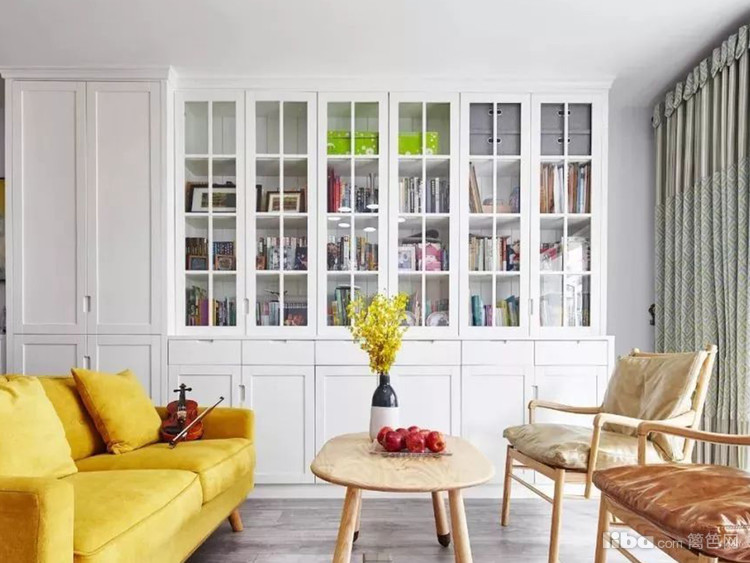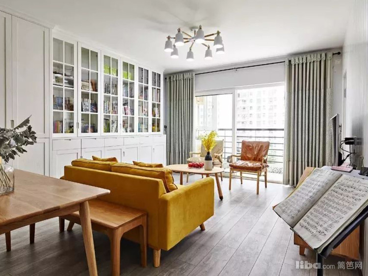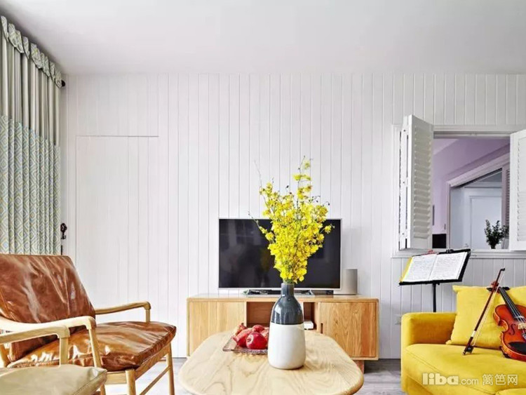 实木与真皮材料的运用增添居所质感,鹅黄色布艺沙发凸显空间活泼时尚感,白色拉槽电视背景墙包含主卧隐形门片。