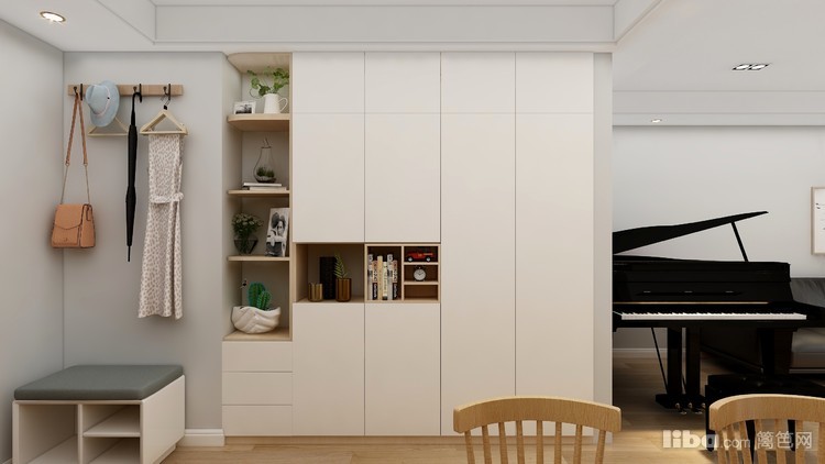 客餐厅一体化 全屋浅色调为主 原木色与跳色的茶几黄色板凳 相呼应 整体 温馨大气。一进门的换鞋凳与柜子 方便客厅日常的生活。