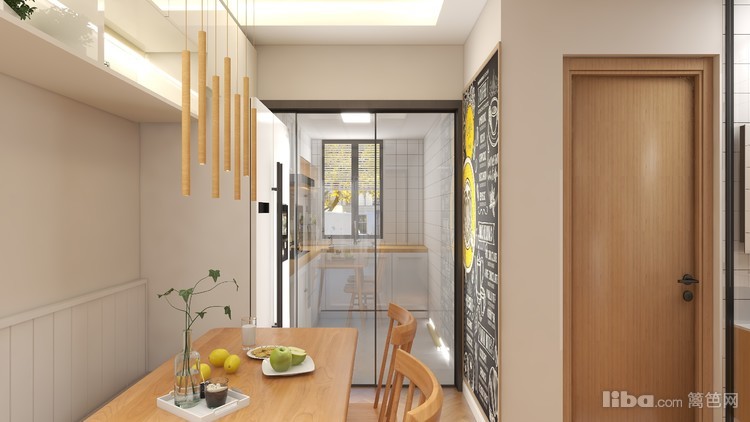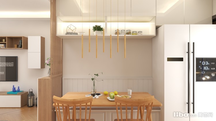 餐厅简单的原木色系桌椅 做得吊柜 满足储物空间 简单的金色系小吊灯 做为装饰 与整体协调 呼应。