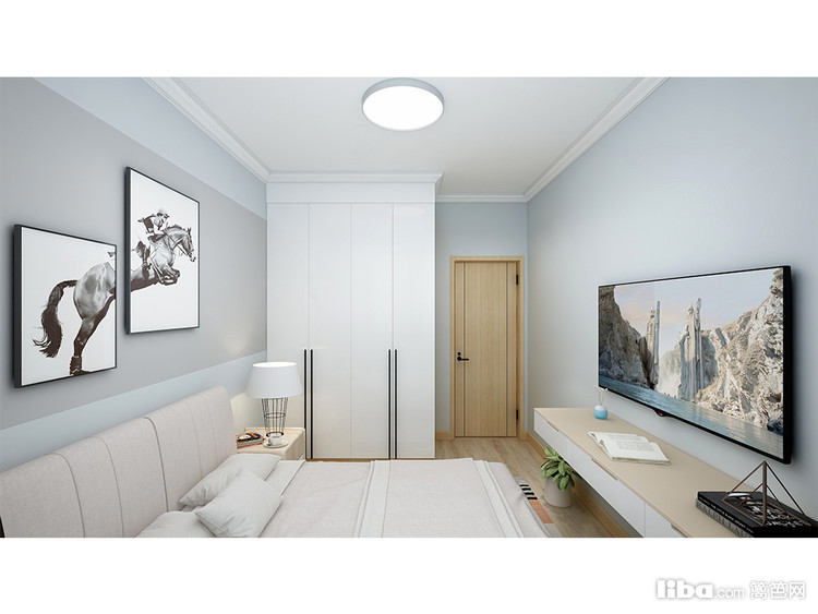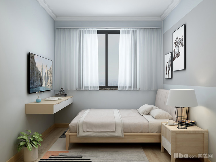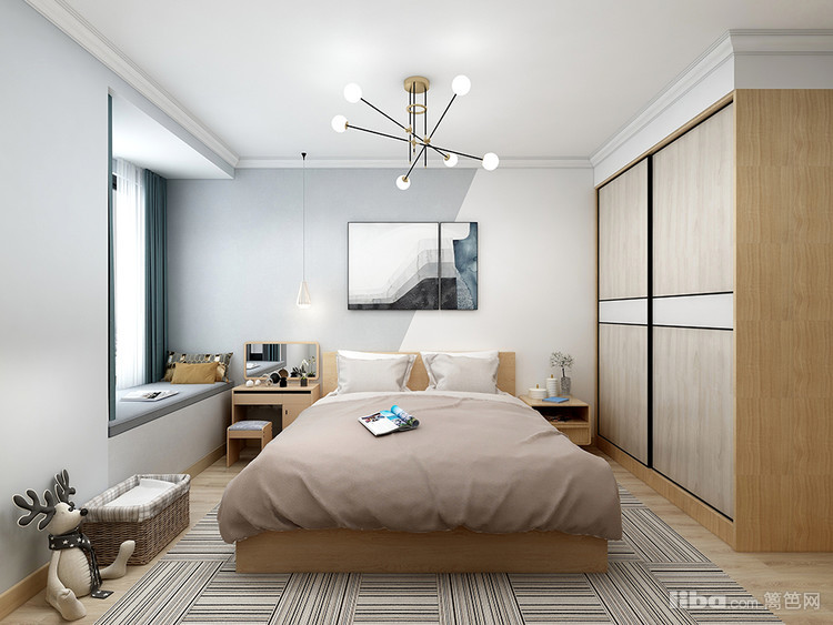 主卧次卧都是原木色 搭配蓝灰白色调,主卧做了飘窗 ,方便日常休闲,主卧一旁的床头柜 设计成了梳妆台 还是很符女主心意的 。