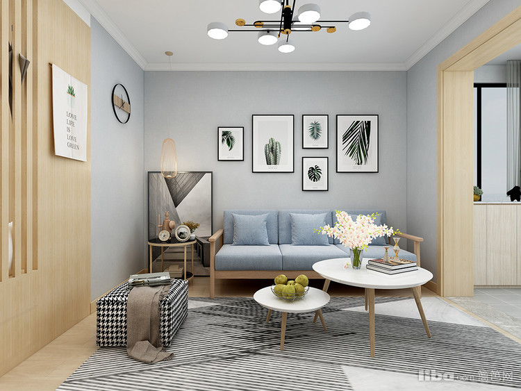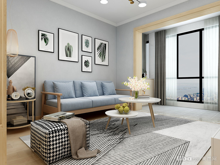 客厅地板原木色为主 又以原木色作为隔断客餐厅区域,灰色的沙发背景墙 简单的挂画做为装饰 大大的落地窗 增加采光 整体简单不失温馨。