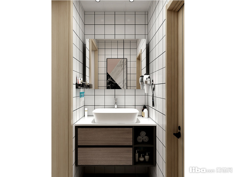 卫生间 做得干湿分离,白色小方格墙砖与灰黑色系地砖相搭配,同样采用原木色的门与整体相呼应。