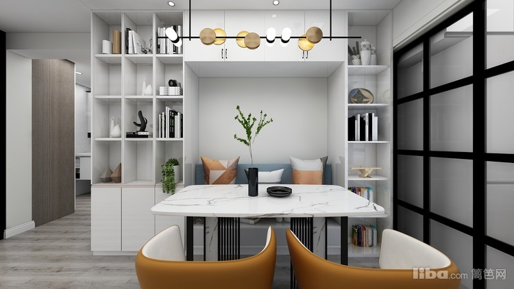 餐厅区域 简单桌椅 餐边柜中间区域设计了嵌入式餐椅 跳色抱枕以及亮色餐椅 作为点缀 。