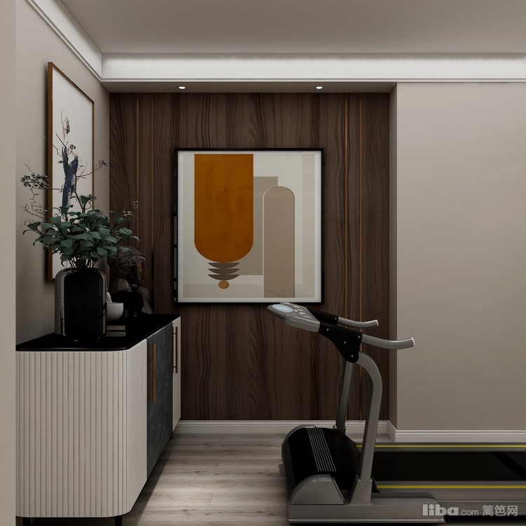 客厅采用落地窗式的窗户 增加整体采光 阳台区域摆了方便休闲的桌椅 一边的阳台柜 设计成书架 一变的跑步机 又方便日常的休闲运动 整体设计温馨和谐 。