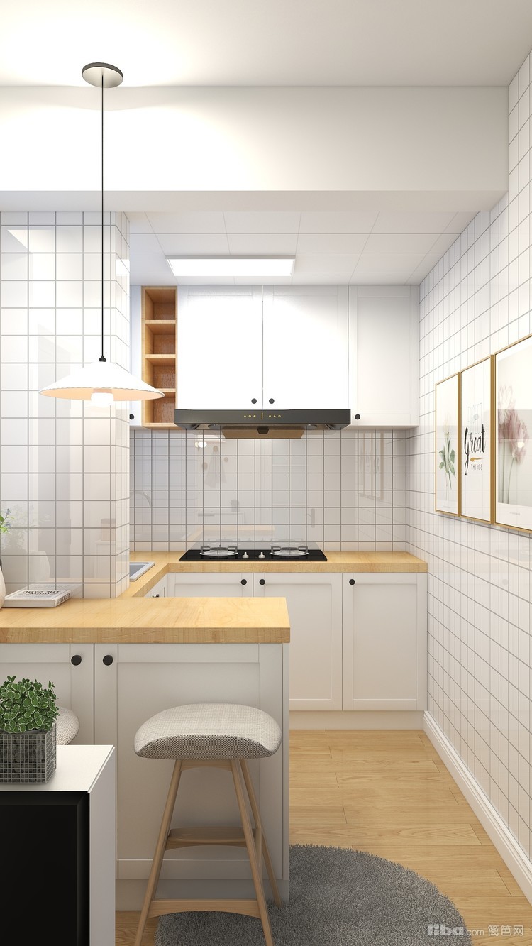 厨房开放式的 做得吧台 白色与原木色相搭配 收纳柜以白色调为主 方便日常简单烹饪与用餐。