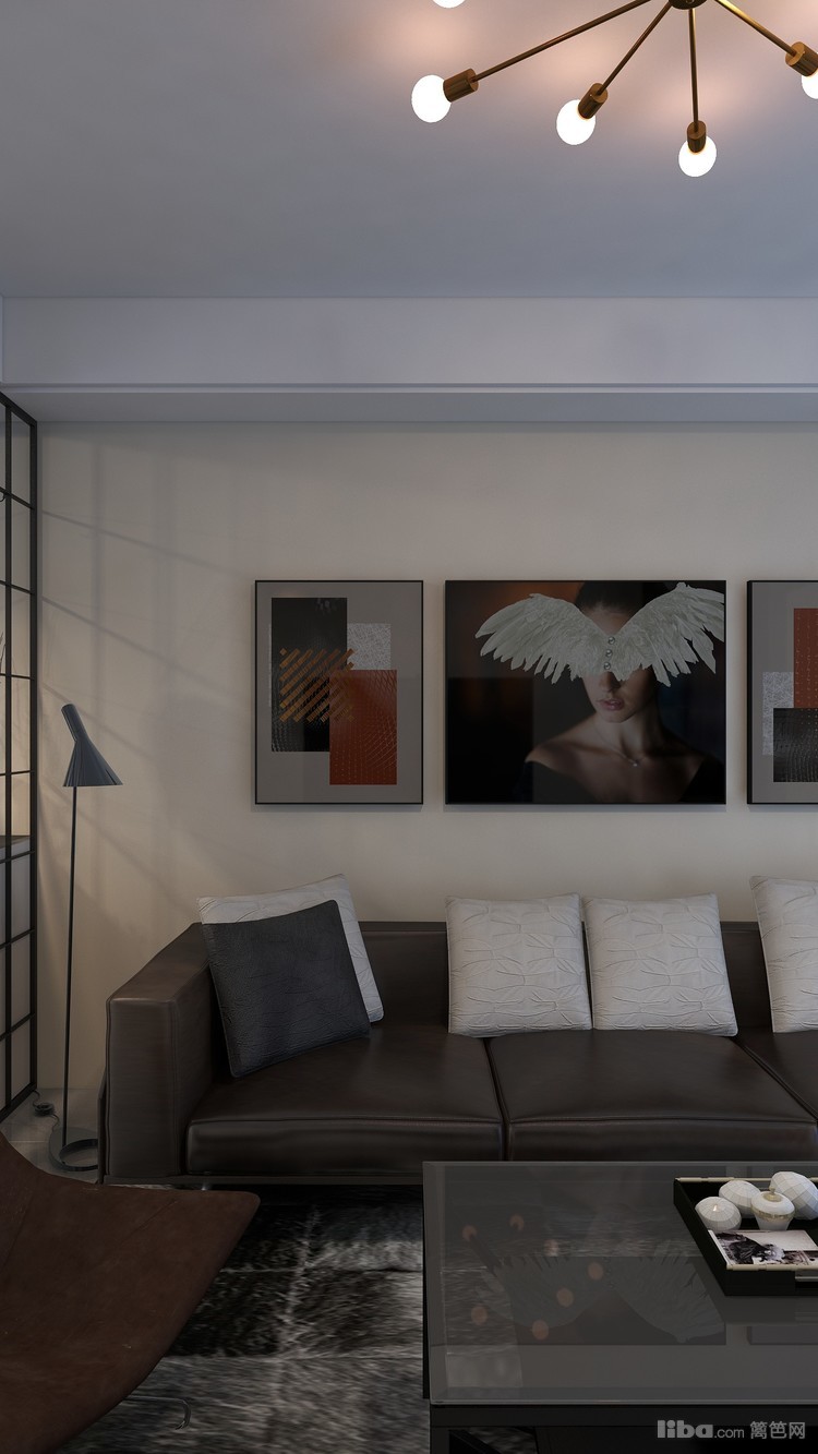 客厅做得落地窗 增加整体采光 整体色调偏冷色系 个性的壁画设计作为装饰搭配浅色调的沙发抱枕与电视下柜 整体大气有格调。