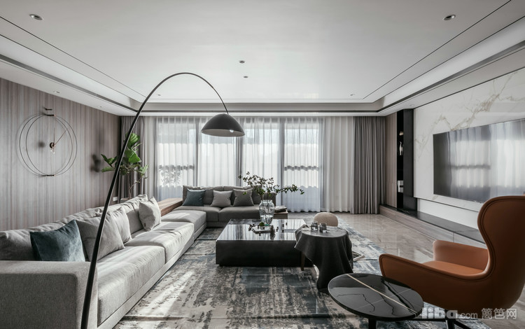 全屋以低饱和度的灰色为基调,一抹赤橙和大理石岩板为空间增添了不少高级的质感,客厅成为一个家的中心