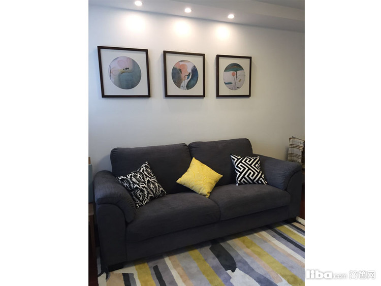 深灰色的沙发配上条纹的地毯,拉长整个客厅的视觉感。