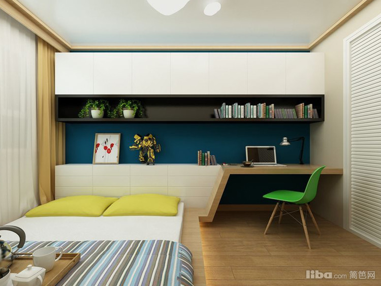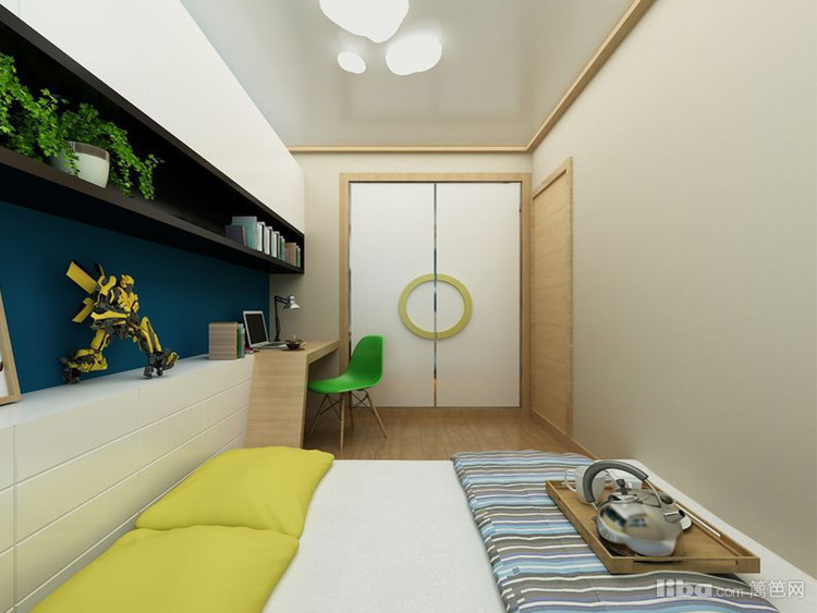 相比于客厅和餐厅,卧室在简洁的基础上多了一些色彩,多了一些趣味。墙边的木门给人一种别有洞天的感觉。
