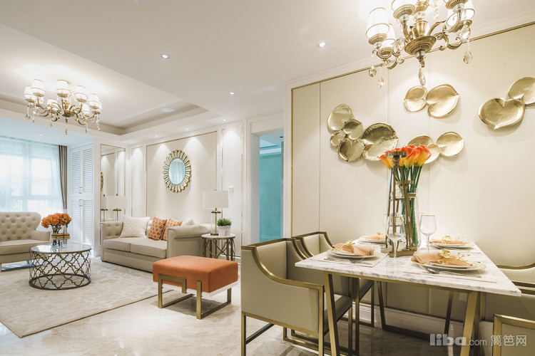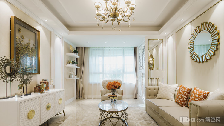 客厅以白色调为主 橘色为点缀色 墙面装饰比较多