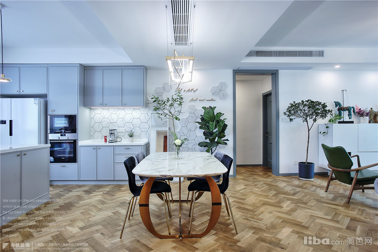 餐厅是后现代简约吊灯,铁艺VS玻璃材质,简单的线条层叠相加,立体感很强;