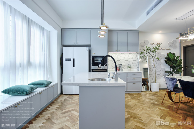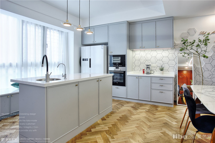 岛台安置小型水池,同时也具有西厨的收纳功能。一些西点、烧烤等美食,女主人就会在这里完成;