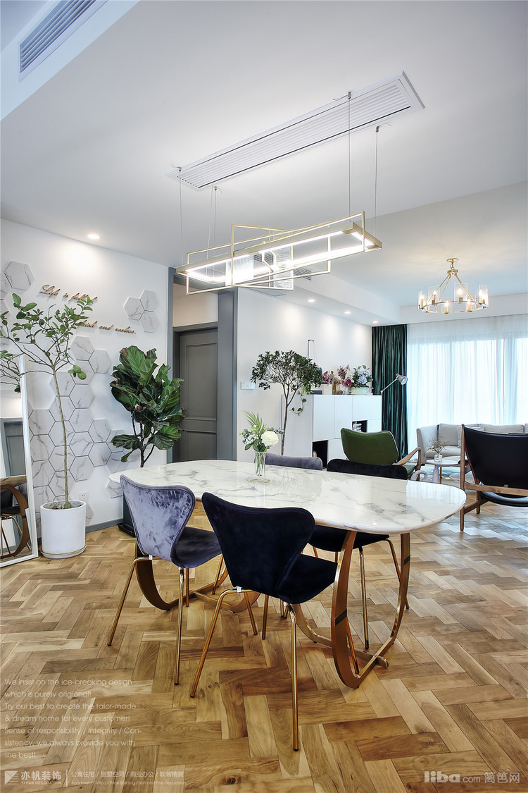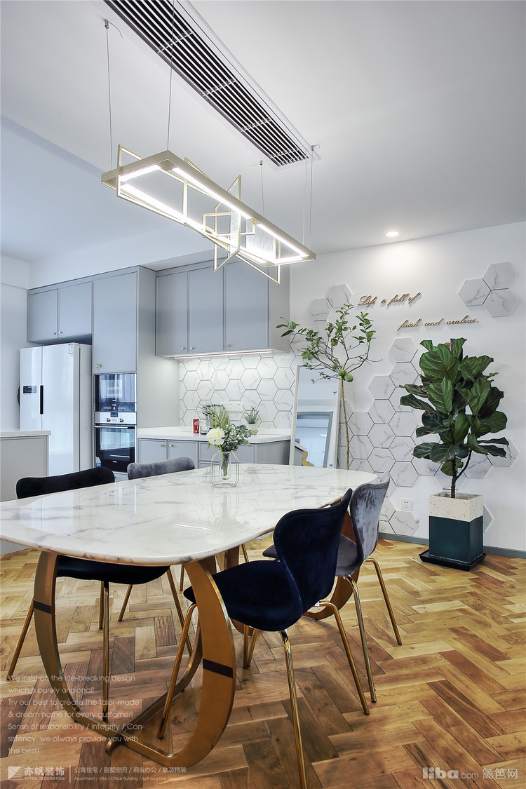 餐桌椅风格是北欧轻奢的代表,金色丝绒布艺餐椅VS金色大理石餐桌,丝绒质感柔软、视觉效果很是高雅;
