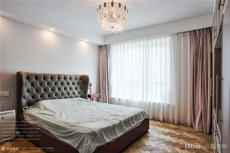 卧室窗帘同样是丝绒质地,中粉色系,百褶款式,多了一丝浪漫的气息