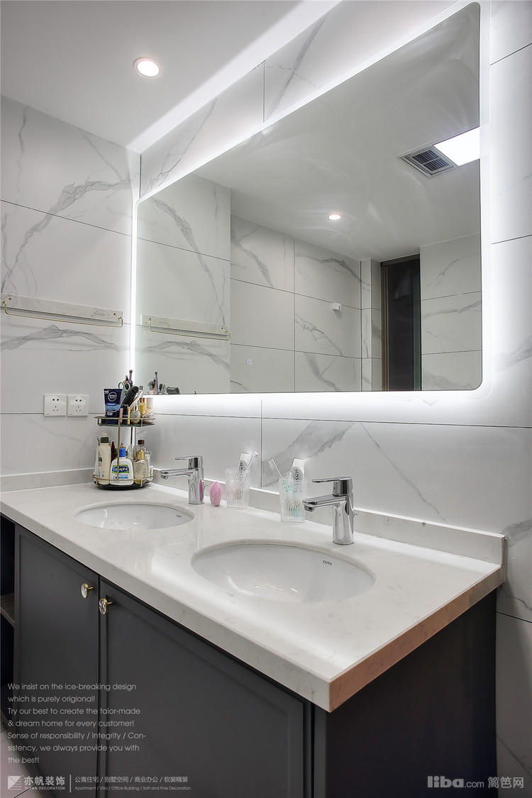 双台盆的设计,日常使用更加便利。 防雾镜面,即使沐浴后的热气四溢,也不影响使用哦~