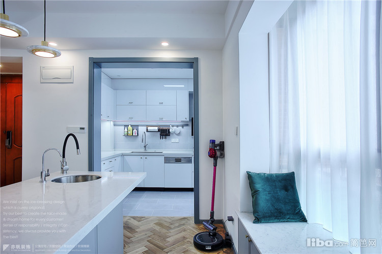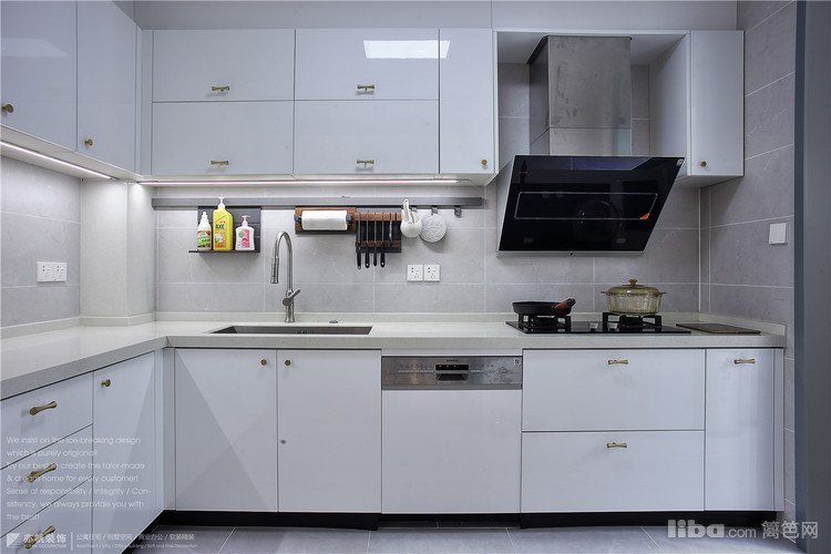 中厨位于西厨内侧,半开放式格局!橱柜L型设计,选用进口亚克力饰面板,很光亮也很是好打理~