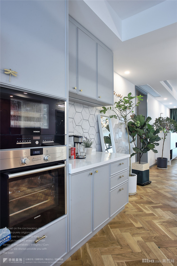 浅灰门板,也可以说是浅雅青色,搭配纯铜拉手,很有轻奢范儿~