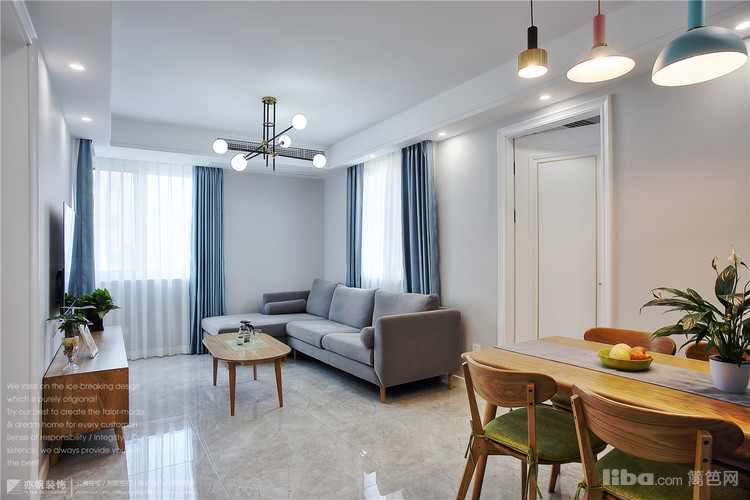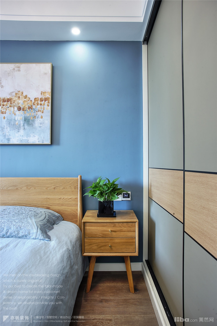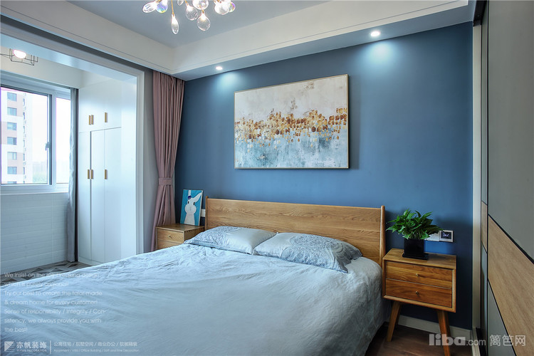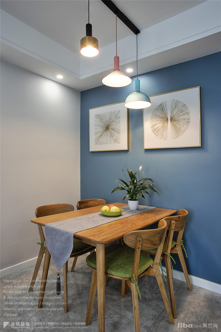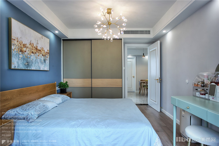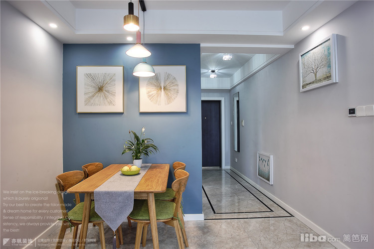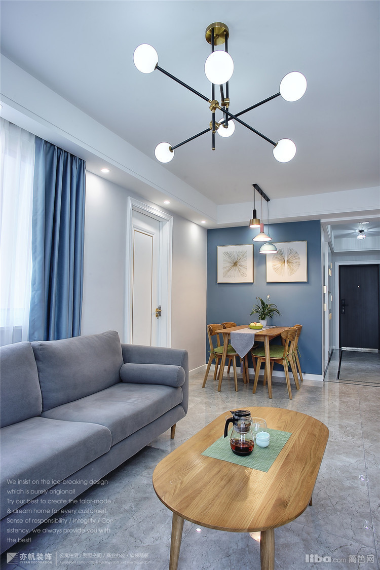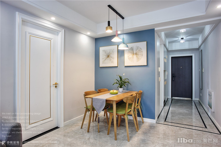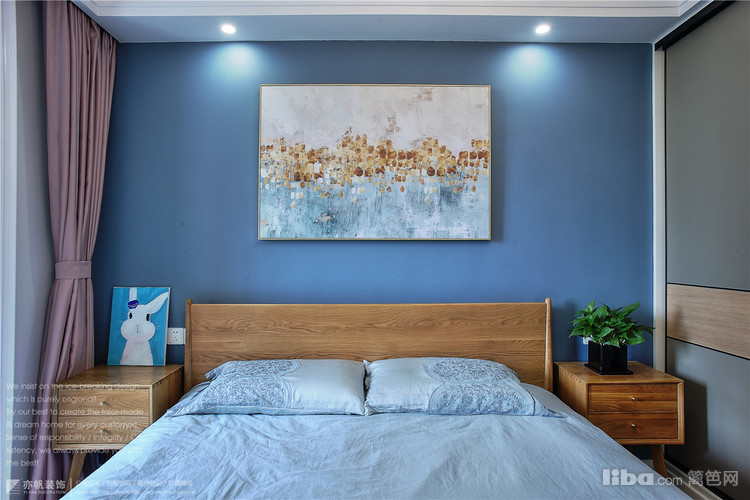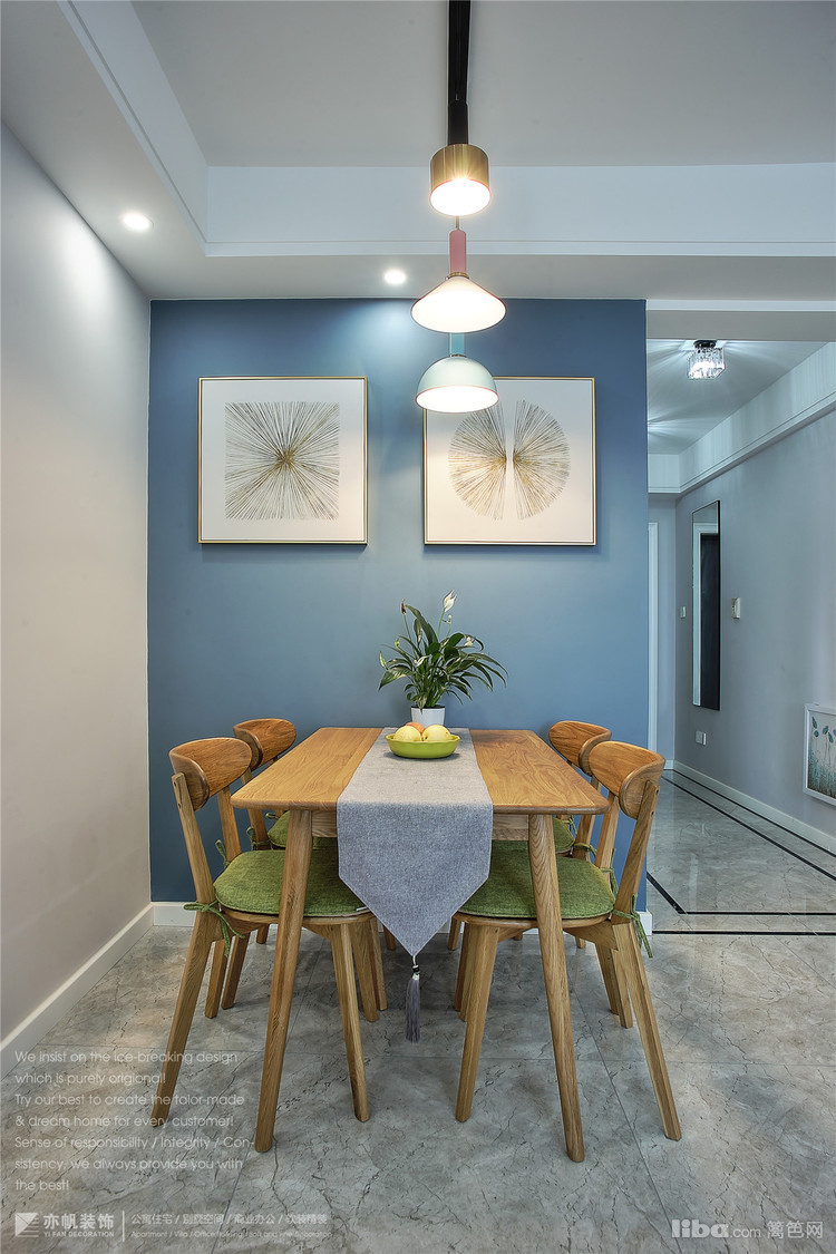 背景墙蓝色乳胶漆粉刷,与客厅窗帘、餐厅背景色完美呼应~