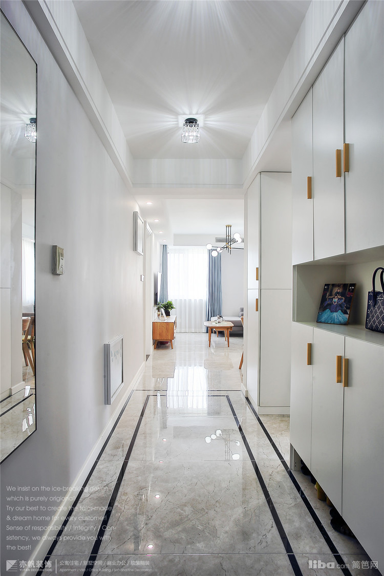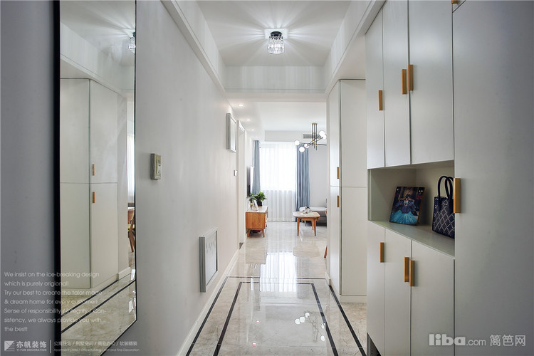 进户门玄关处贴墙挂了穿衣镜,格局改造后,空间感很强,进户门出的收纳功能也是很棒!