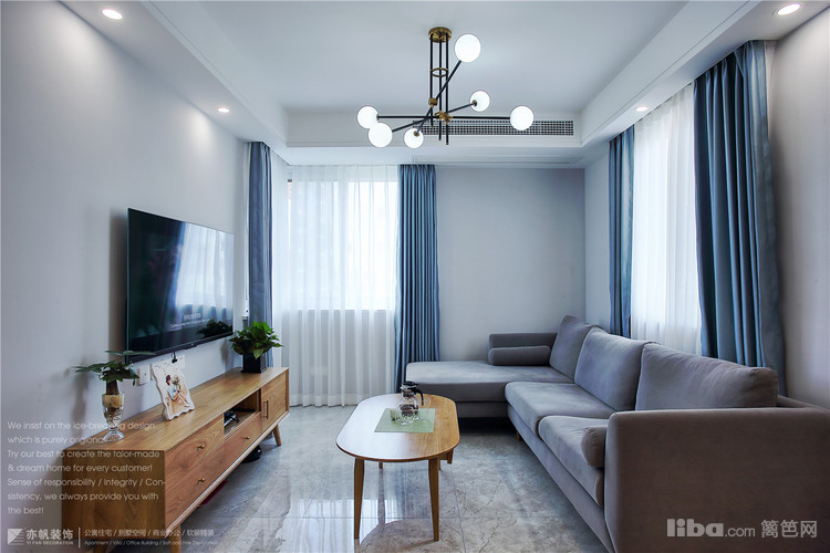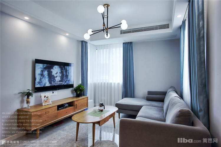 蓝色窗帘,遮光率85%左右,业主表示不希望全遮光,有一定的通透感,会觉得更舒适自然;