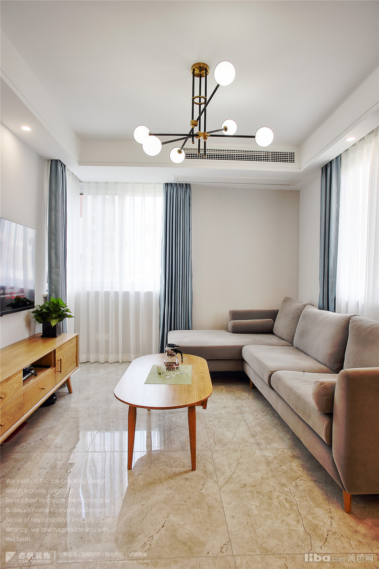 客厅沙发是绒面布艺款式,搭配原木色椭圆小茶几,是一种很怡然自得的生活态度!