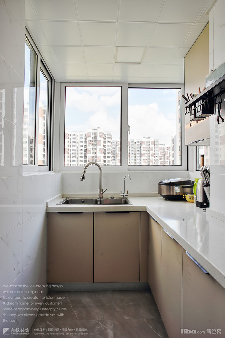 与主卧相连的阳台部分铺设了拼花小砖,一侧定制白色搭配金属拉手的储物柜,美观而实用!