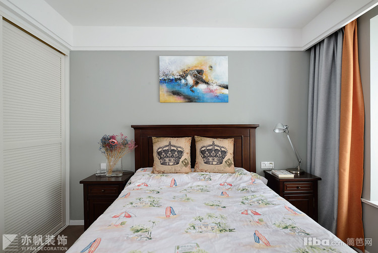 卧室的布局比较简单,美式双人床、两侧床头柜以及定制大衣柜。而窗帘,则是与客厅同款同色的橙灰搭配。