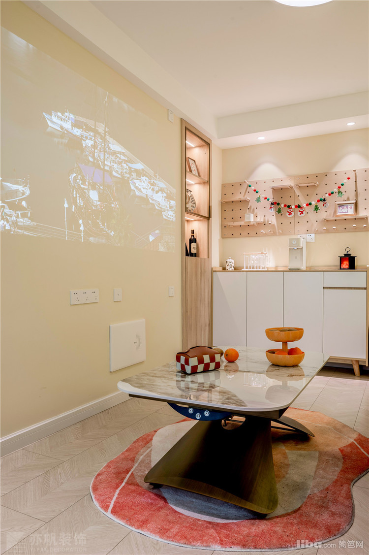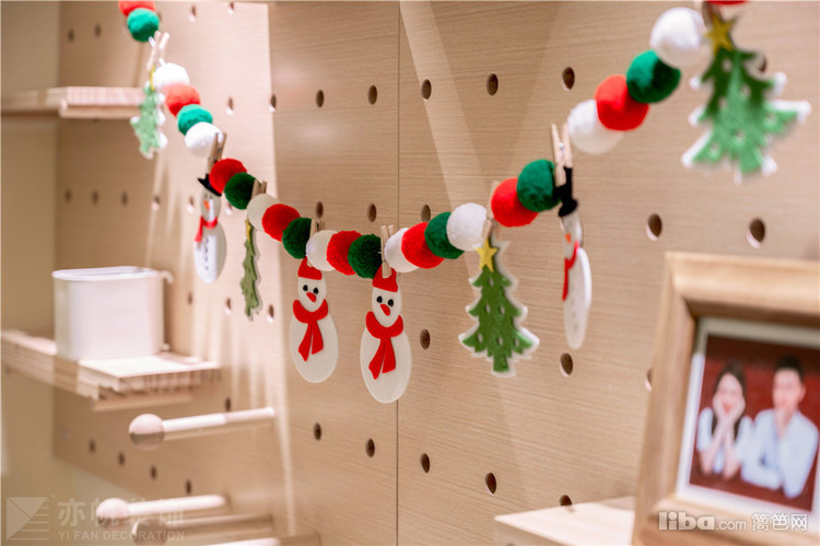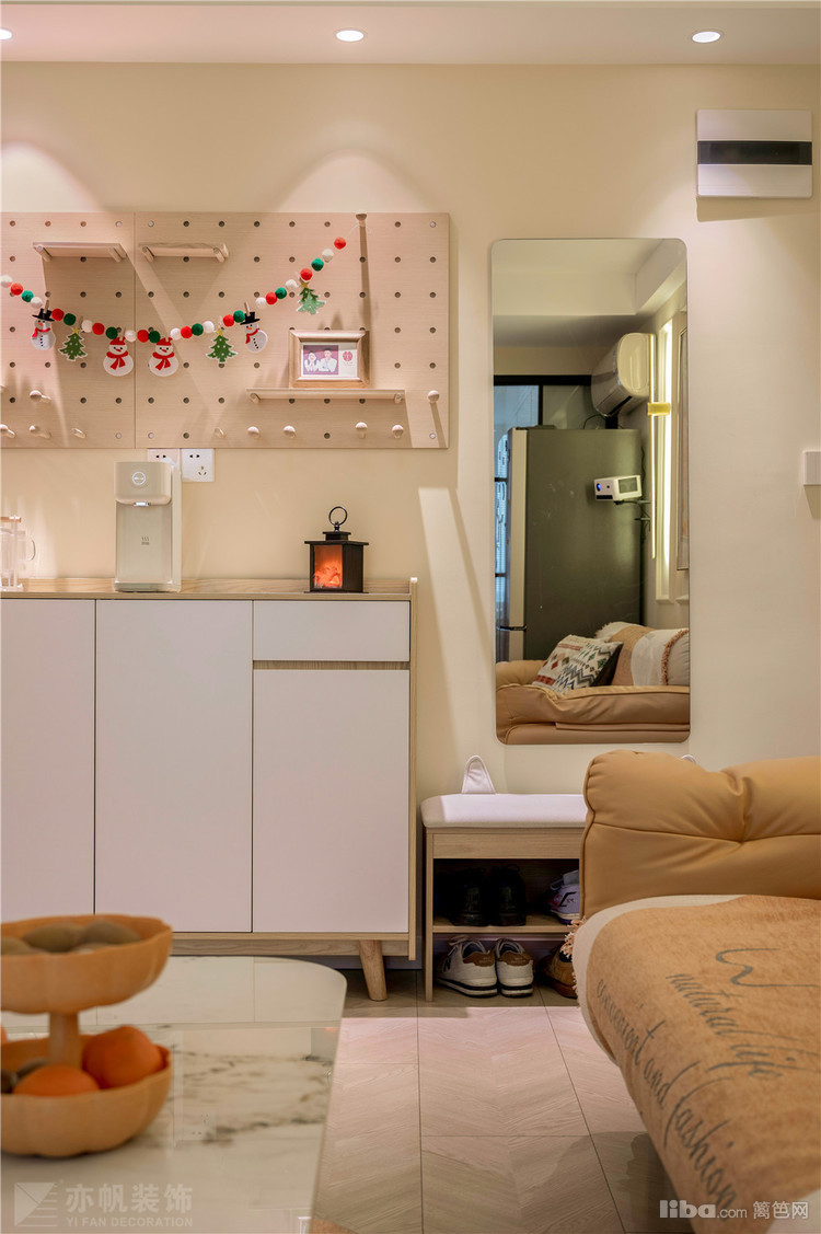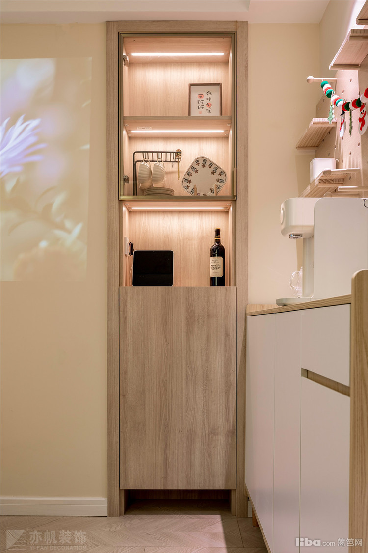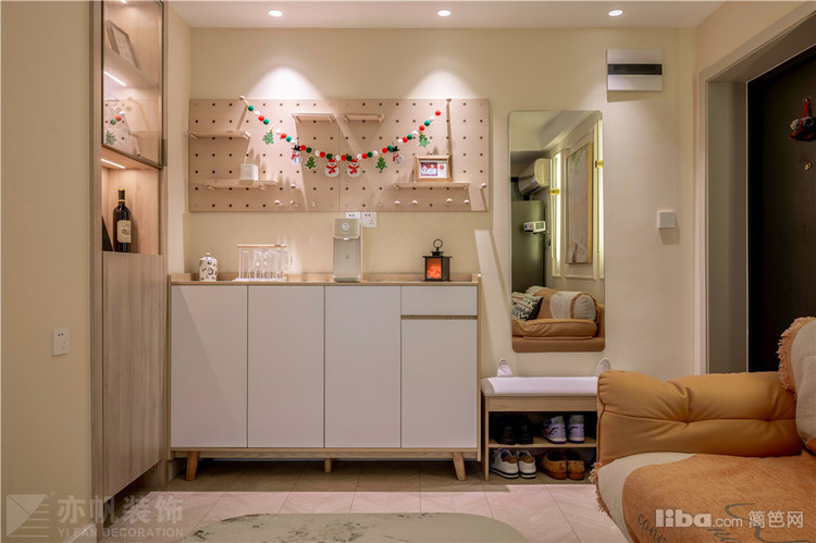 收纳柜上方的洞洞板墙面收纳布置很特别,山峰灯光投射,满满的温馨感迎面而来