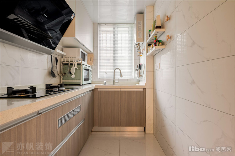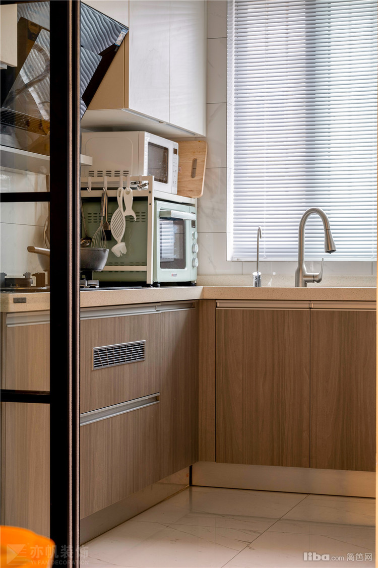橱柜以木色纹理饰面呈现,搭配浅色台面,日系氛围信手拈来~