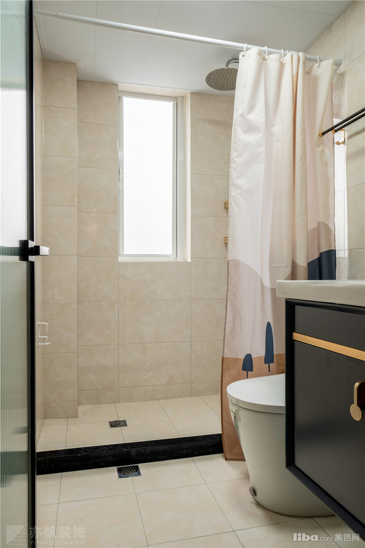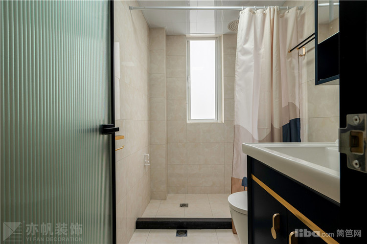 长虹玻璃推门后,是黑白色系卫浴空间,浴帘隔开干湿区,通透且清爽