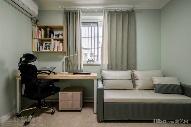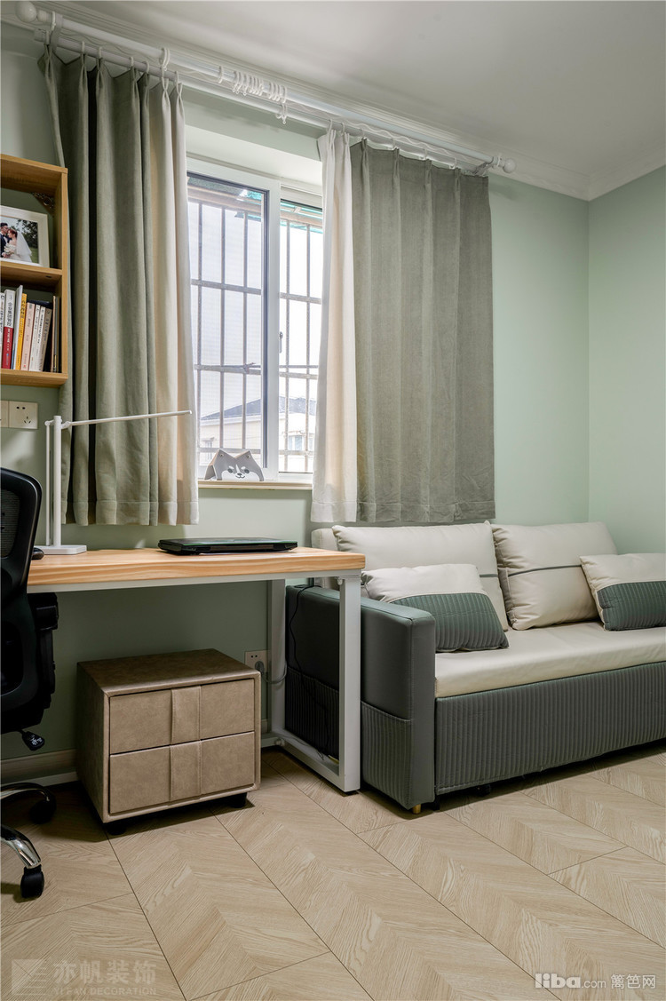 次卧以书房+沙发床搭配,父母偶尔来小住时,展开沙发就是小而温馨的次卧空间