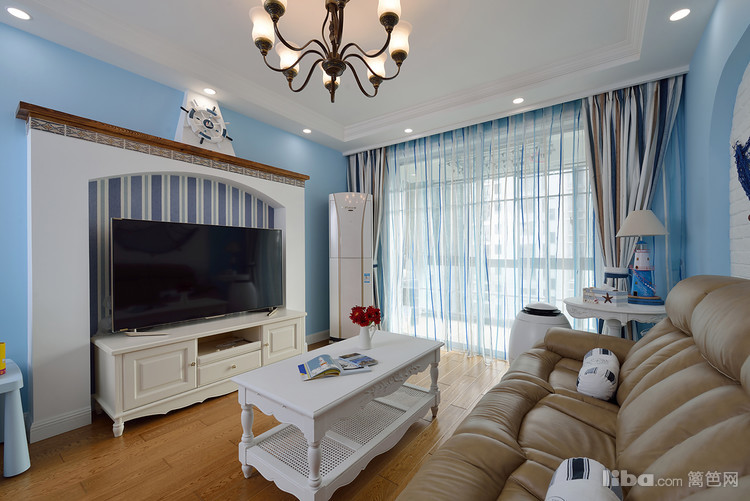 含蓄、理解时尚味道在客厅弥漫,棕色的沙发,带来温馨浪漫风格,搭配上纯白色的茶几电视柜,复古大气。多彩的落地窗帘,黄棕色地板,高端大气,背景墙极有设计感,颇具地中海风情。