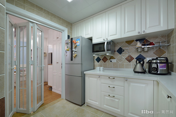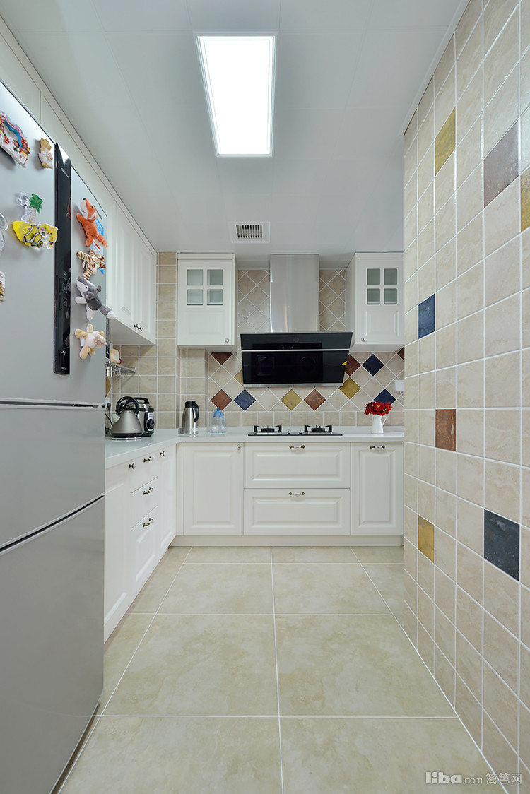 清新自然的厨房,拼花的多彩墙砖,浓浓的田园气息,时尚的美感中透漏着实用.