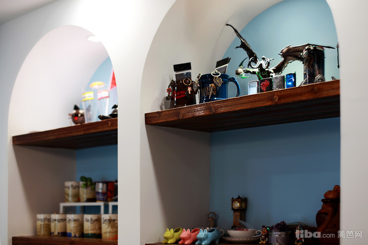 木条拼接的吊顶很有特色,多宝阁的壁柜和条纹色的卡座,打造出清新优雅的气息