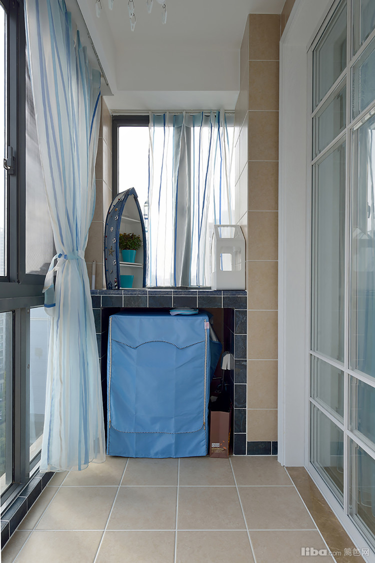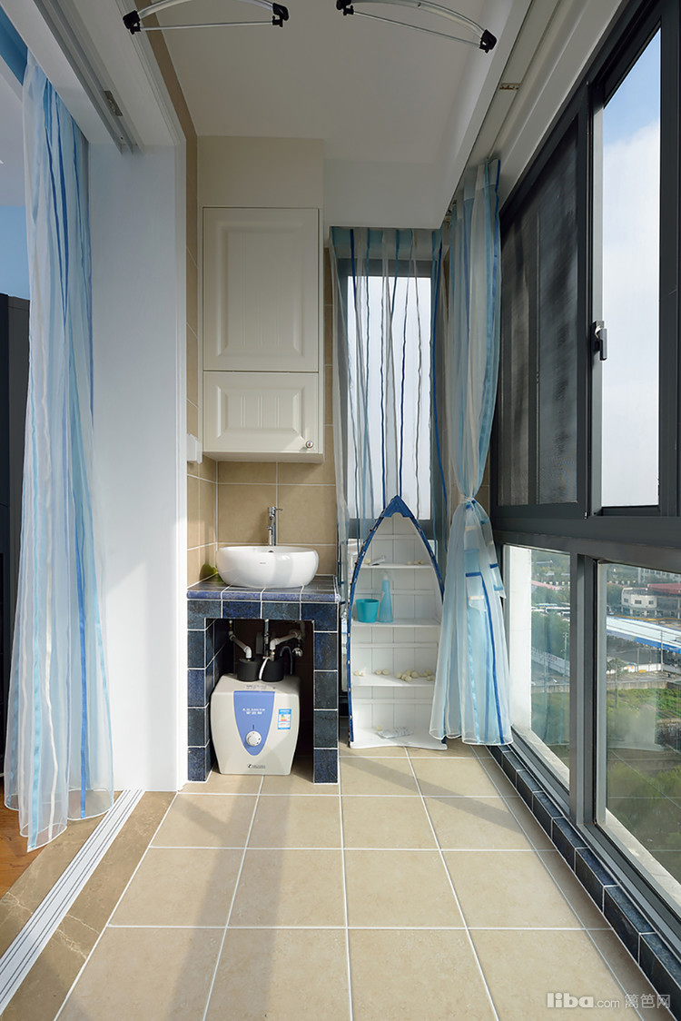 阳台的设计与主体风格一致,设置了洗漱台,方便实用,柜子和船型收纳,都极尽巧思,美观和实用并存