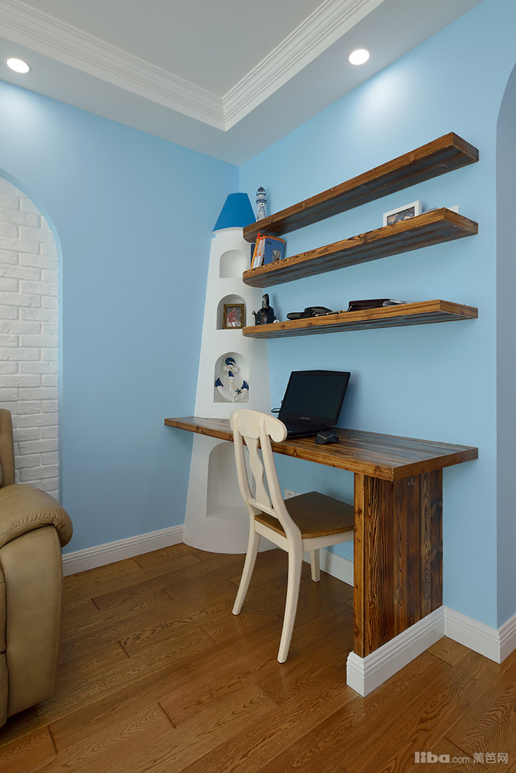 另辟蹊径的书房,利用墙角空间所设置的储藏架,趣味十足
