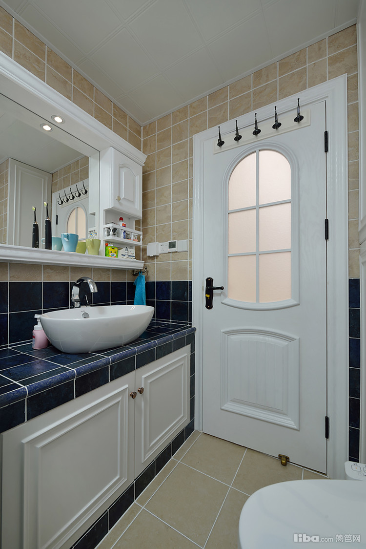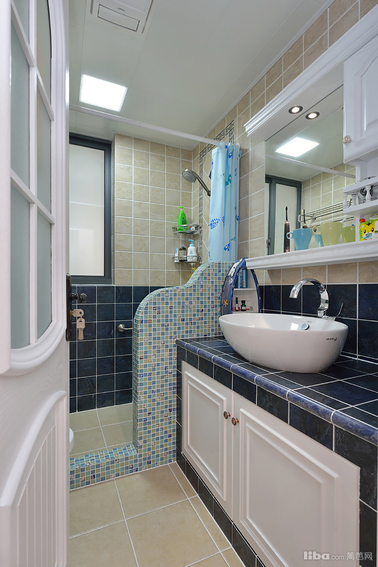卫生间的空间有限,但是这一抹宁静和淡雅的蓝色,从台面到淋浴半拱门,都显示出设计师的小心思,一股海洋的气息扑面而来