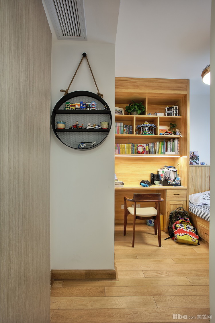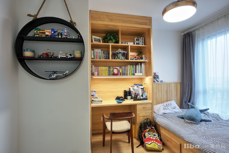 原木色系定制书柜+同色系榻榻米小床,空间利用井井有条,层次分明。