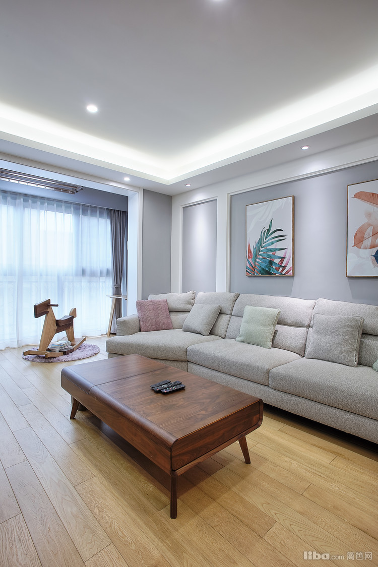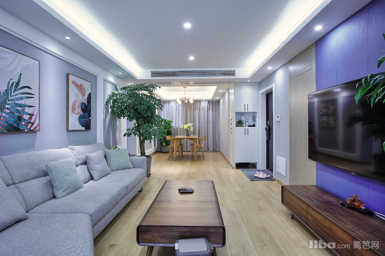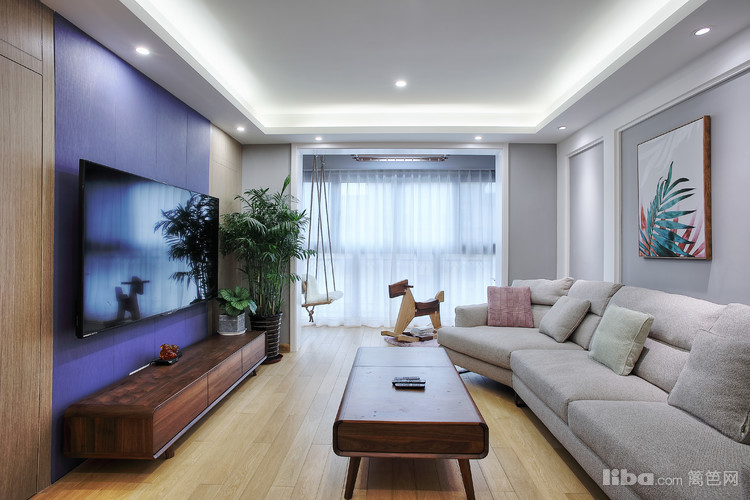 北欧风的壁画,米灰色的长沙发,都给人舒适自然的感受。电视背景墙采用电光紫这种前卫的色彩,形成了鲜明的对比度。