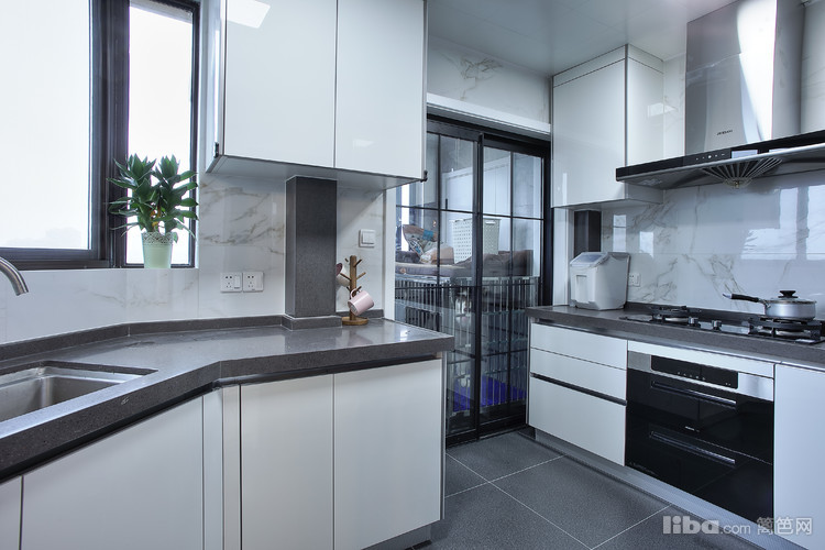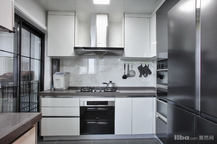 珠光白的橱柜面板,搭配深灰色石英石台面,厨房的高级感很是强烈。