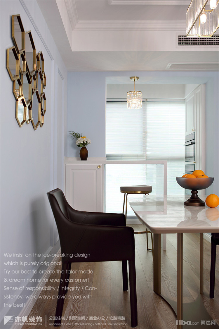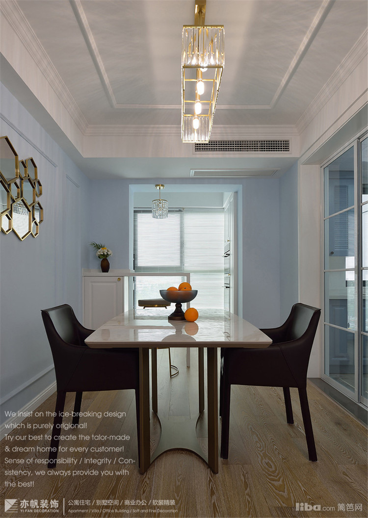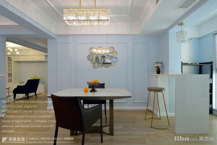 餐厅墙面延续客厅浅蓝色系,水晶一体吊灯、大理石台面餐桌、皮质餐椅
