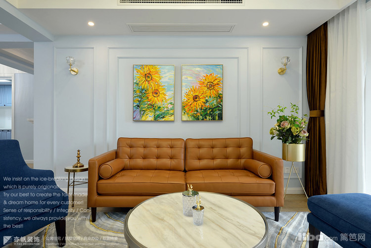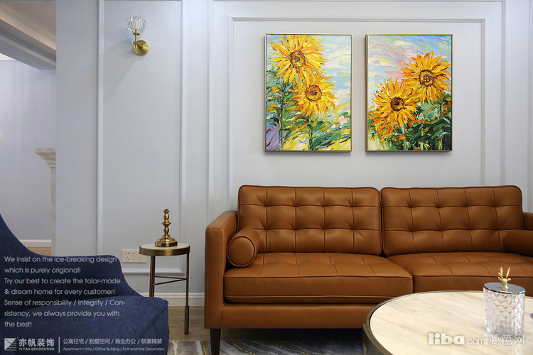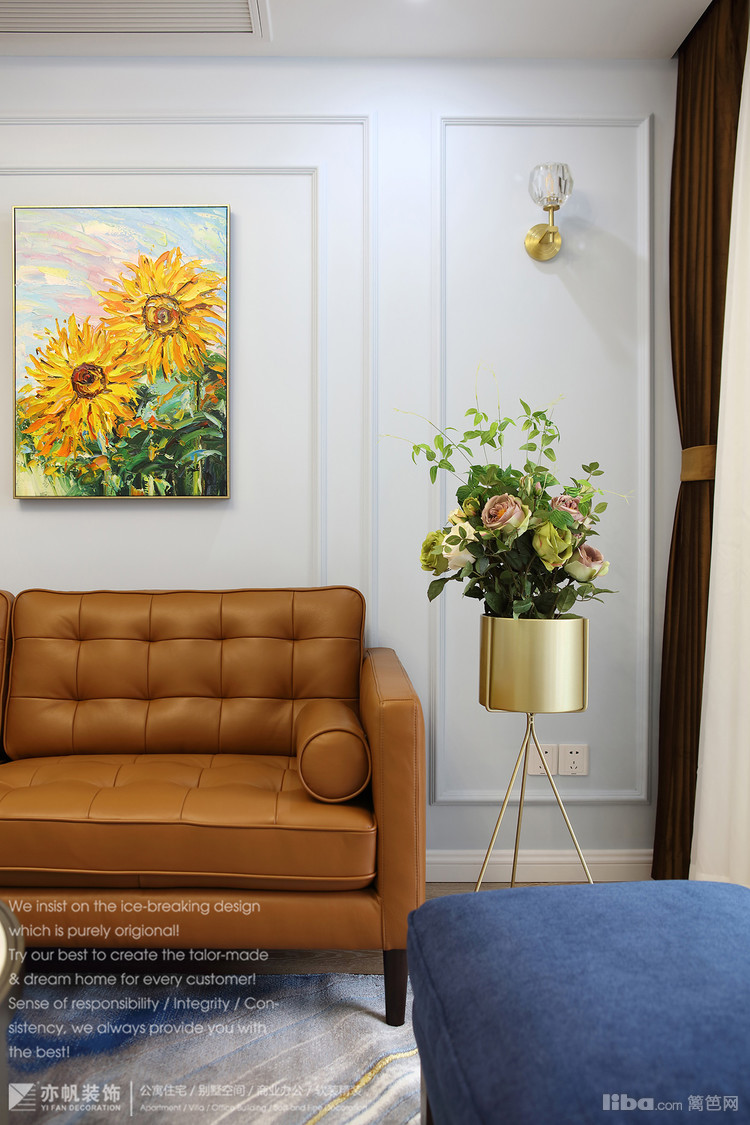 沙发背景中间两幅向日葵油画,佐以两侧壁灯+射灯,搭配沙发两侧金属小几、金属花架,小资轻奢感轻松而生。