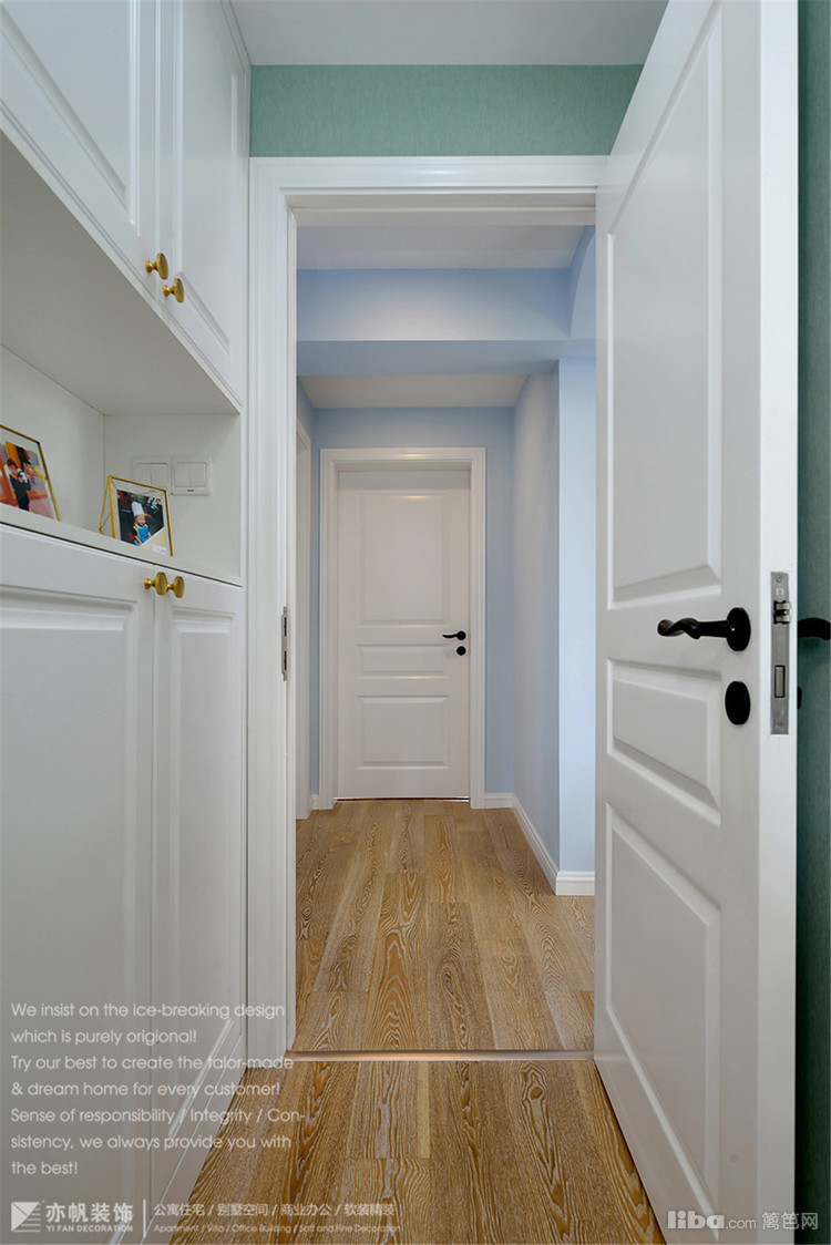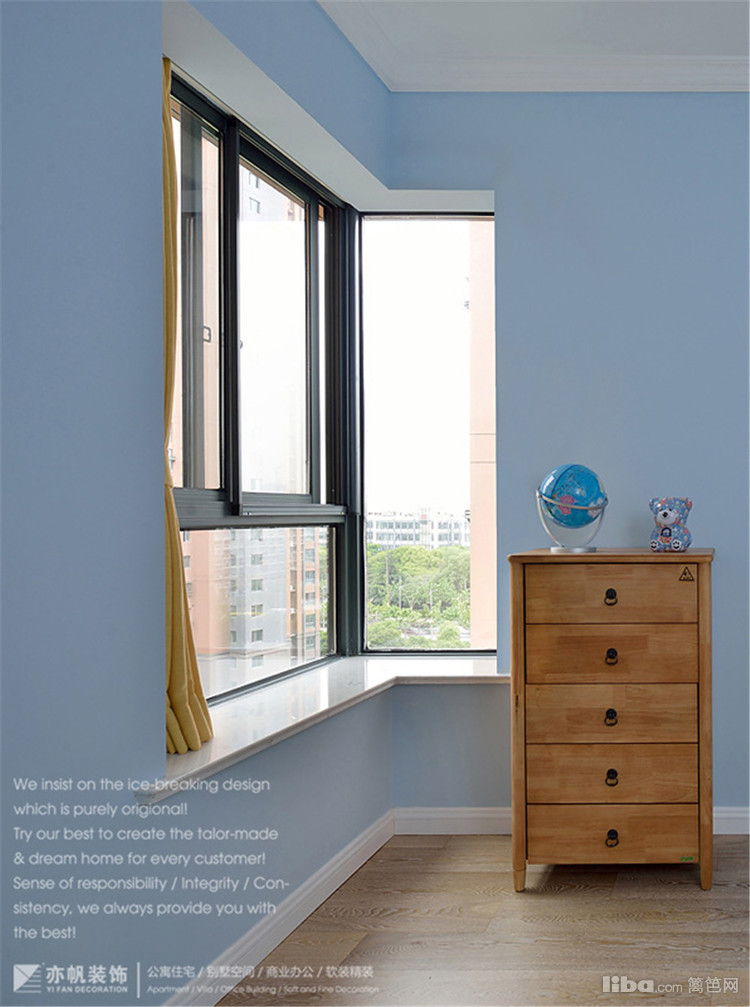 宝贝的房间还是以蓝色为基调,搭配原木色系环保家具,给宝贝独立而安静的学习、生活空间。