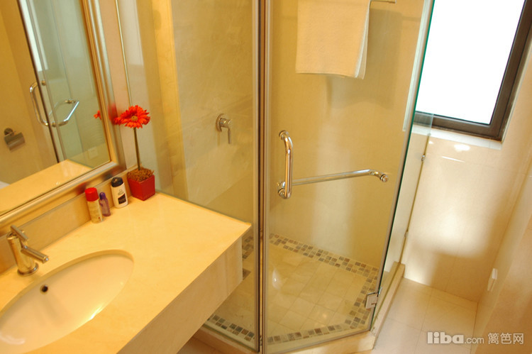 卫生间使用干湿分离的设计,淋浴间位于空间一角,圆弧的设计很好的解决了空间狭小的问题。