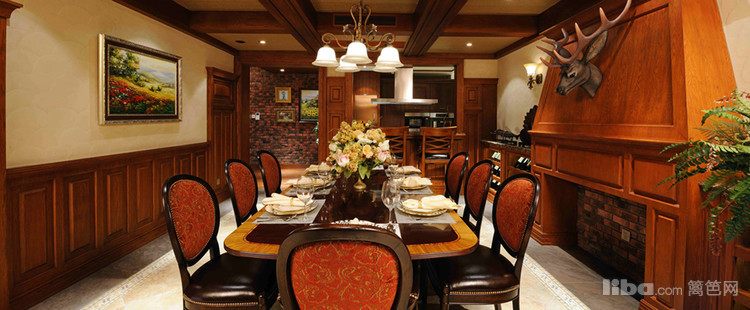 整个餐厅区域的布局恢弘大气,墙面的鹿角增添了就餐时的氛围感。